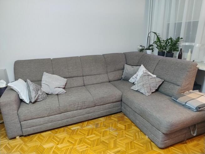 Narożna sofa z funkcją spania. Mebel w kolorze beżowym, wykonany z wytrzymałego materiału. Posiada pojemnik na pościel ...