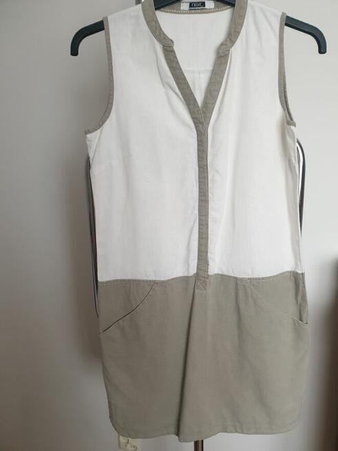 Sukienka letnia szmizjerka krem khaki w rozmiarze M 55% len + 45% wiskoza ozdobne szwy kieszenie długość 92 cm biust ...